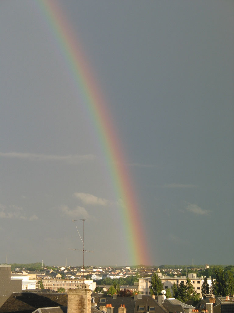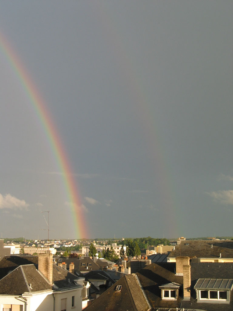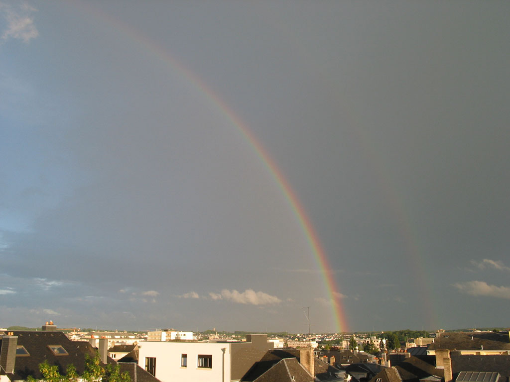 Here are a few photos of a rainbow that I took from my flat in Luxembourg, there are 2 interesting things. The first is that there is a faint second rainbow to the right of the main one. The second is that the sky appears much lighter 'inside' or to the left of the main rainbow. Thanks to Jef Raskin for first explaining to me the cause of this. I have since also found comprehensive explanations of both phenomena here.